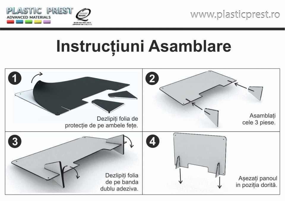 PREȚUL SE ACTUALIZEAZĂ AUTOMAT ÎN MOMENTUL ÎN CARE SE VOR SELECTA TOATE OPȚIUNILE PANOULUI!!! TRANSPORTUL ESTE GRATUIT PENTRU COMENZI MAI MARI DE 999 DE LEI!!! !!! PANOUL POATE FI COMANDAT ÎN ORICE DIMENSIUNE - DREPT SAU CURBAT!!! Claritate și rezistență mare la impact Panourile de protecție sunt confecționate din placi transparente plexiglas , cu o t ransparență de cristal inerentă , cu o greutate redusă si cu o rezistență mult mai mare decat sticla de aceeasi grosime. Barieră de protecție Panourile de protecție pot fi utilizate în industria farmaceutică, alimentară, în sistemul bancar, precum și în orice activitate care presupune lucru cu publicul, asigurând o barieră de protecție atât pentru angajați, cât și pentru clienți. Panourile de protecție pot fi utilizate în prevenirea răspândirii virusurilor prin împiedicarea contactului direct între angajați și clienți. Panourile de protecție pot fi curățate cu ușurință cu apa și săpun. Montare ușoară și fixare de durată Panourile de protecție beneficiază de un design revoluționar și pot fi montate cu ușurință pe un birou sau pe orice suprafață orizontală, fără prinderi complicate, fără șuruburi și fără a fi nevoie de instrucțiuni de montare. Acestea au aplicate pe elementele de suport o banda dublu adeziva 3M pentru o fixare puternică de durată. Panourile de protecție conțin și elementele de suport produse din plexiglass cu grosimea de 6 mm, care sunt debitate laser pentru o potrivire perfectă. Panourile de protecție pot fi furnizate întregi sau cu un orificiu în partea de jos prin care pot fi schimbate documente, sume de bani, pot fi efectuate plăți prin intermediul POS etc. Adaptare la nevoile clientului Pretul se poate negocia în funcție de cantitate. În situația în care aveți nevoie de alte lungimi decât cele disponibile pe site vă rugăm să ne contactați telefonic sau să completați formularul de contact disponibil pe site.