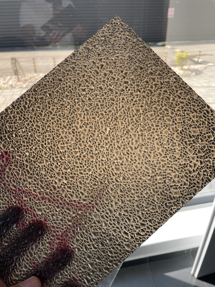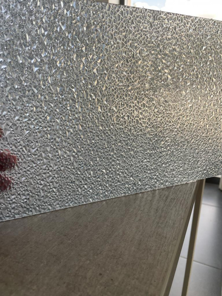 Placile din policarbonat solid / compact DIAMOND au un aspect de diamant pe una dintre parti iar pe cealalta parte sunt lise Placile din policarbonat solid / compact DIAMOND sunt recomandate atat pentru placarea GARDURILOR cat si pentru acoperișuri de orice fel(curbe sau drepte) datorită rezistenței excelente atat la radiațiile UV, cat si la impactul cu grindina. Placile din policarbonat solid / compact au la bază performanțele ridicate ale rășinii de policarbonat, aceste produse vă oferă o calitate excelentă îmbinată cu proprietăți elastice excelente, o rezistență ridicată la impact, precum și liberatea de proiectare și formabilitate. Caracteristici și avantaje Protecție UV pe ambele fețe Rezistență ridicată la impact de 250 de ori mai rezistent ca sticla Aspect sablat pastrand discretia Stabilitate dimensională la temperaturi cuprinse între -40 si +120 grade Celsius Greutate redusă Formabilitate la rece, debitare cu orice scule de lemn Corespunde normelor Autorității pentru alimente și medicamente din SUA Rezistență la foc, practic incombustibil Aplicații tipice Garduri; Vitraje verticale; Aplicații de interior; Caști și scuturi de protecție pentru forțele de ordine; Vitraje de siguranța/blindate, geam antiefracție Capitonari dube Aplicații în industria alimentară și a medicamentelor. Spălătorii RECOMANDARI MONTAJ: - Calculati cu atentie incarcarile pentru golurile respective; - Tine ti cont de dilatarea termica 0.065mm/mC,(pregaurire) pentru a evita crapaturile longitudinale.
