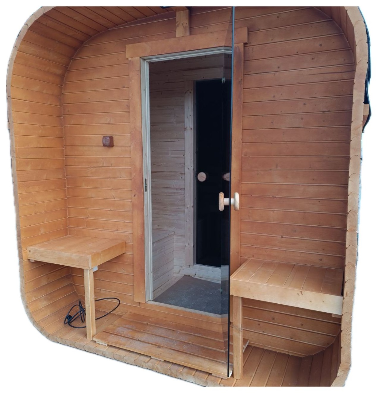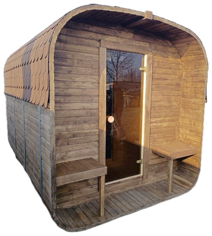 STRUCTURA SI MATERIALE: • Pereți și tavan: realizați din lemn masiv de molid suedez premium rezistent la temperaturi ridicate, cu o umiditate de 14%, rezistent la crapaturi si avand o durata de viata de peste 15 ani. Grosimea peretilor 45mm oferind o izolatie premium de lunga durata • Bănci: realizate din lemn de arin pentru a nu se supraincalzi, fiind perfecte pentru persoanele cu piele sensibila sau pentru copii, așezate pe doua niveluri din lemn. • Uși: 2 bucati STICLA SECURIZATA (culoare brown) rezistentă la temperaturi mari • Acoperis: sindrila bituminoasa de culoare brown. • Antecamera cu doua banci si spatii de depozitare • Terasa exterioara cu doua banci din lemn