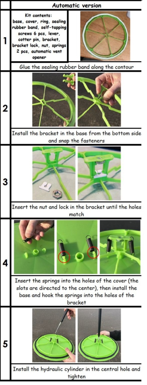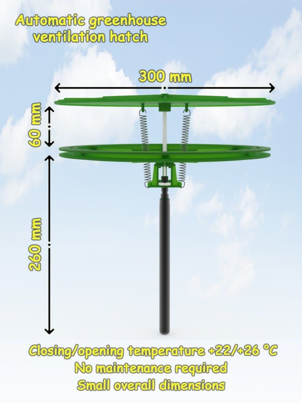 Ventilatia automata este destinata serelor cu latime de 3 sau 4 m asigurand un flux de aer suplimentar. Specificatii: diametru: 300mm ventilatie: 60mm temperatura lucru piston: - inchide +22 grade - deschide + 26 grade protectie UV pistonul este produs in Olanda, folosit cu succes in domeniul serelor. Avantaje: permite ventilarea serei automat nefiind nevoie de energie electria reistenta la vant instalare usoara Vizioneaza GHID MONTAJ (CLICK)
